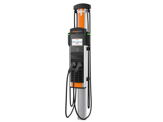 – Dual-port, wall-mount CP6000 unit with two 23′ SAE J1772™ cables, 8′ cable management and 8″ color display. - Professional installation